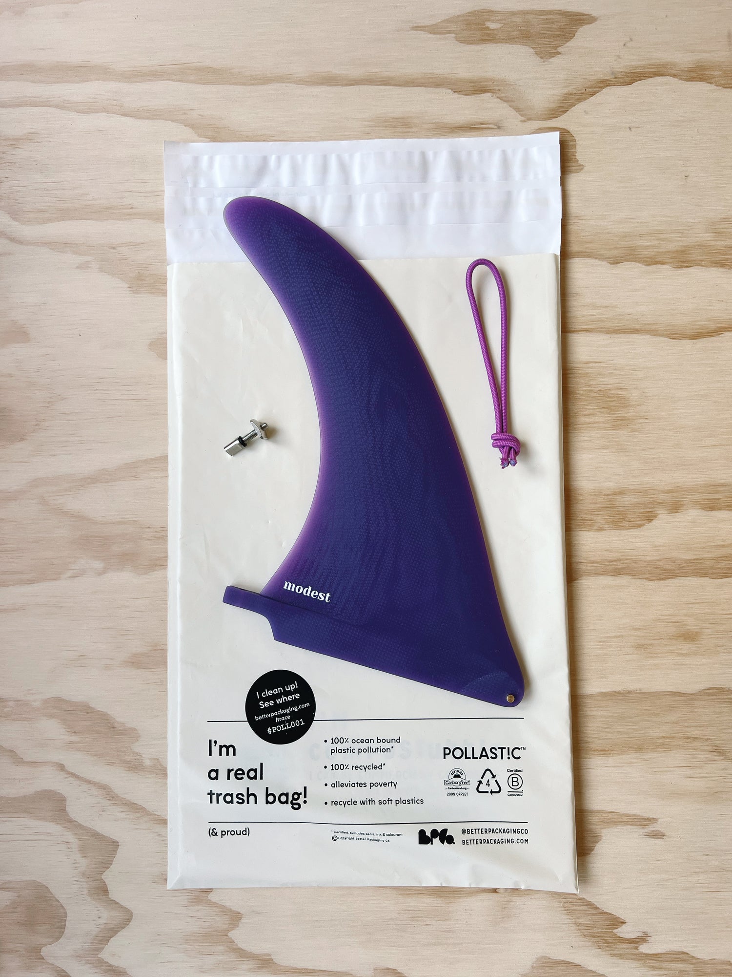 All of our modest fins are delivered to you in Better Packaging Co's 100% recyclable mailer made from ocean bound plastic with a compostable bubble insert to keep your fin protected.